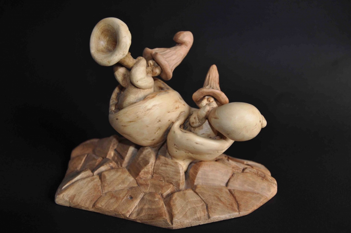Le opere in legno, in particolare, spesso nascono dall'osservazione di forme naturali di oggetti quali radici e sferoblasti, escrescenze nodose che sporgono dai tronchi degli alberi. Le forme e i «movimenti» che scorgo in questi legni, infatti, mi sembrano suggerire posture e figure che traduco in soggetti dal sapore fiabesco, sempre in equilibrio tra realtà e fantasia.