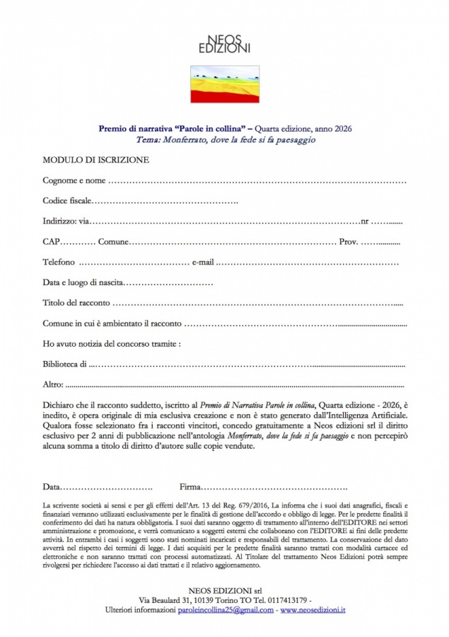 P.S.Il bando, nei prossimi giorni, sarà scaricabile dal sito www.neosedizioni.it nella sezione Progetti (Parole in collina).