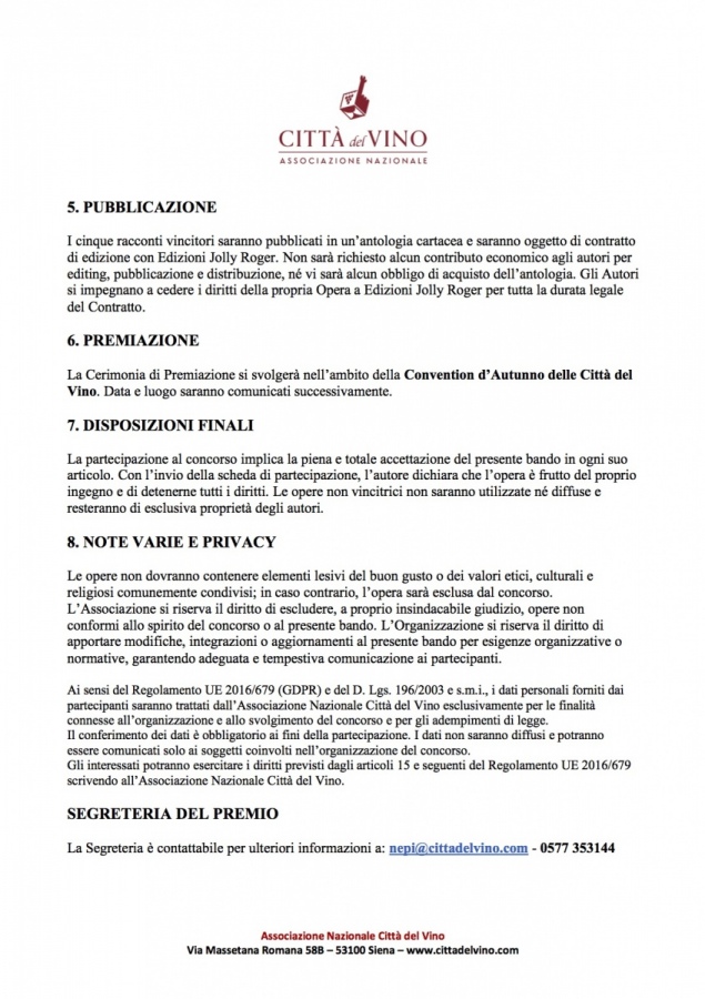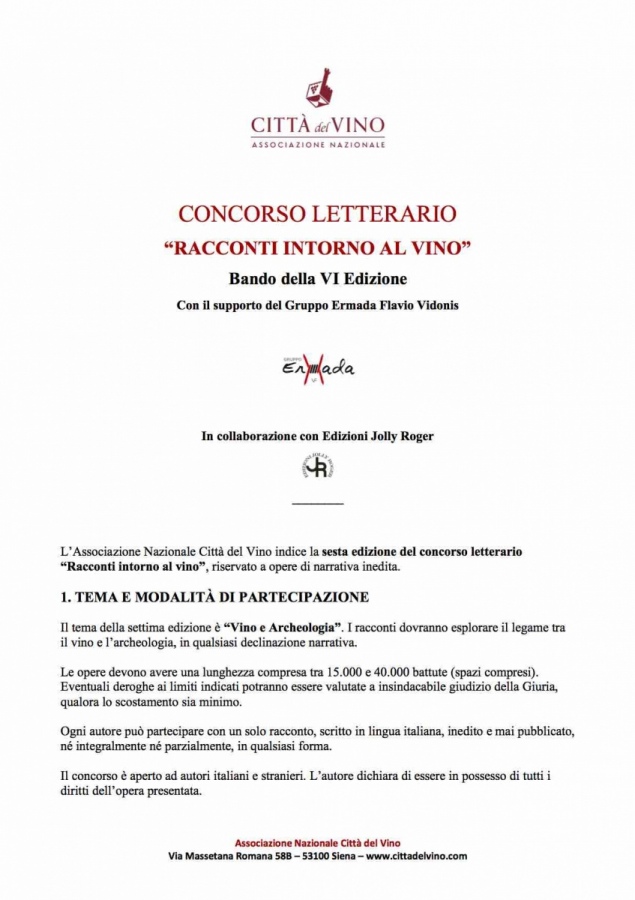 In allegato il bando e la scheda di partecipazione, qui ulteriori informazioni: https://cittadelvino.com/progetti/concorso-letterario-racconti-intorno-al-vino/