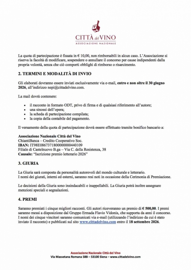 vi ricordiamo che sono aperte le iscrizioni alla VI edizione del concorso letterario «Racconti intorno al Vino», ormai punto di riferimento tra le iniziative dell'Associazione Nazionale Città del Vino. Il tema del 2026 sarà «Vino e archeologia».